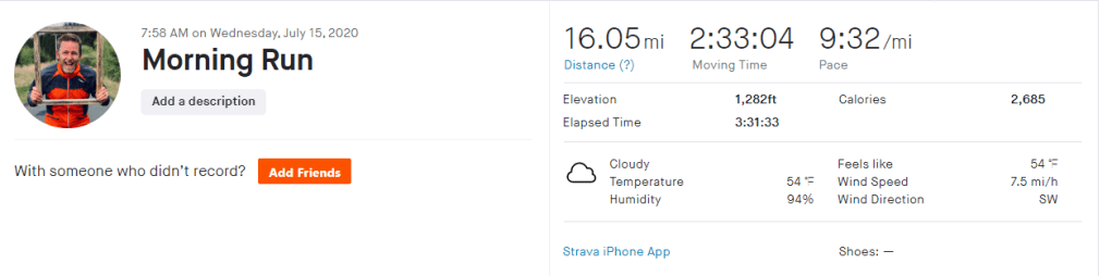 Run 1 complete – 16 miles. Only 84 to go!