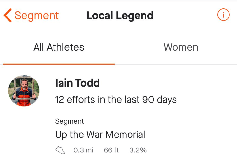 The Strava ‘Local Legend’ achievement is awarded to the athlete who completes a given segment the most over a rolling 90-day period regardless of pace or speed.