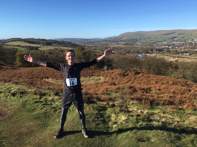 Head down off the hill and cross the road. Follow the path past the fields until you reach the forrest. Stay on the path. Don;t head right up onto Barr Hill. That is the way back.