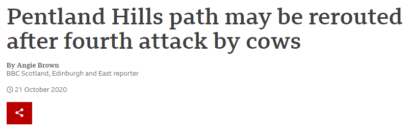 If she had noticed then she wouldn’t have gone out to investigate. She has a fear of cows. Which I think is stange. How can you be scared of something as laid back as a cow? But the very next day there was a headline in a newpaper that read “MAN DIES IN COW ATTACK!” and ever since then I’ve seen lots of similar headlines.
