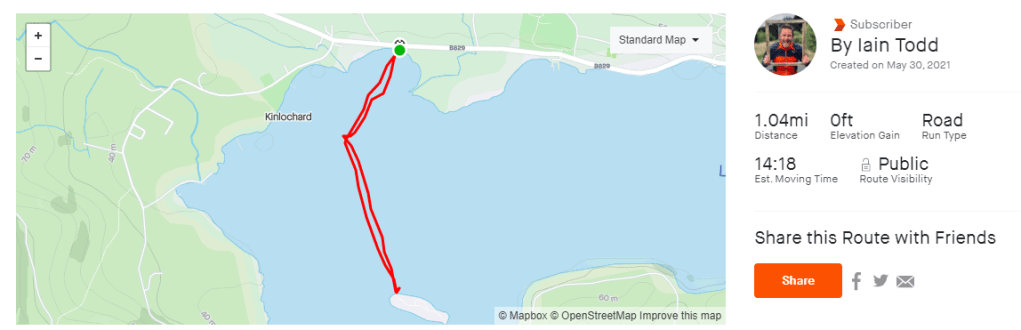 Instead of waiting for an official race I decided to do my own event. A friend of mine created the route. It starts with a 1500m swim in Loch Ard, then a 50Kish bike ride around Loch Katrine and then a 9km run to a viewpoint overlooking Loch Ard.