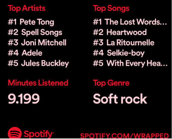 What does the report reveal about me ? It reveals that my wife has figured out my Spotify password! I don’t listen to any of these songs. These are one’s she likes!!