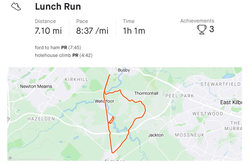 Still feeling tired but another good sleep through a Denzel Washington film – this time The Tragedy Of MacBeth – and I felt more refreshed this morning. To celebrate a fantastic clear day I decided to run in the countryside and park at Busby High School and take a circular route through some of the farm roads on the edge of Glasgow. Now, just another 15 days to go.