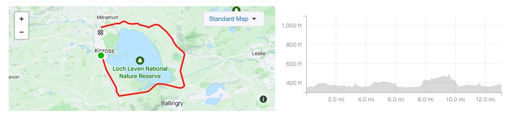 Perhaps to make up for the start line, the Loch Leven Half Marathon must also be one of the easiest half marathon loops in Scotland. You start beside metal sheds. You immediately turn right and then you only have to turn left three times after that before you’re back at the start. That’s one turn every four miles. You can’t get easier than that without running along the M8 to Edinburgh.