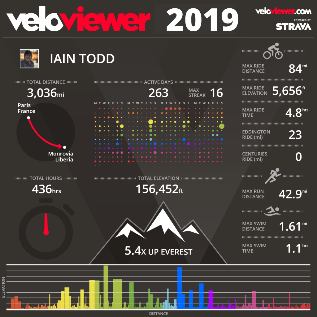 It shows I managed to cover just over 3000 miles of swimming, biking and running which is enough to take me to Monrovia in Liberia.