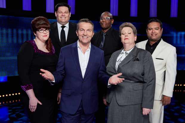 Pictured: (l-r) Chasers Jenny ÔThe VixenÕ Ryan, Mark ÔThe BeastÕ Labbett, Host Bradley Walsh, Shaun ÔThe BarristerÕ Wallace, Anne ÒThe GovernessÓ Hegerty, and Paul Ô’The Sinnerman’Õ Sinha